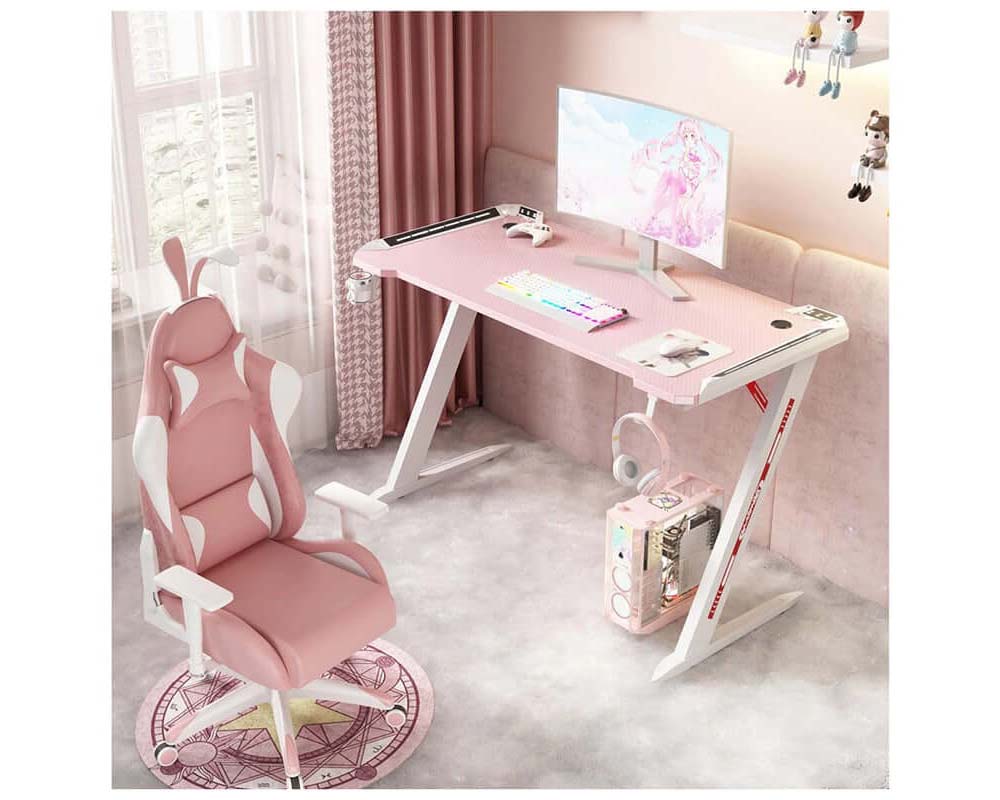 RGB Gaming Desk Home Office Carbon Fiber Led Lights Game Racer Computer PC Table Z-Shaped Pink 120CM