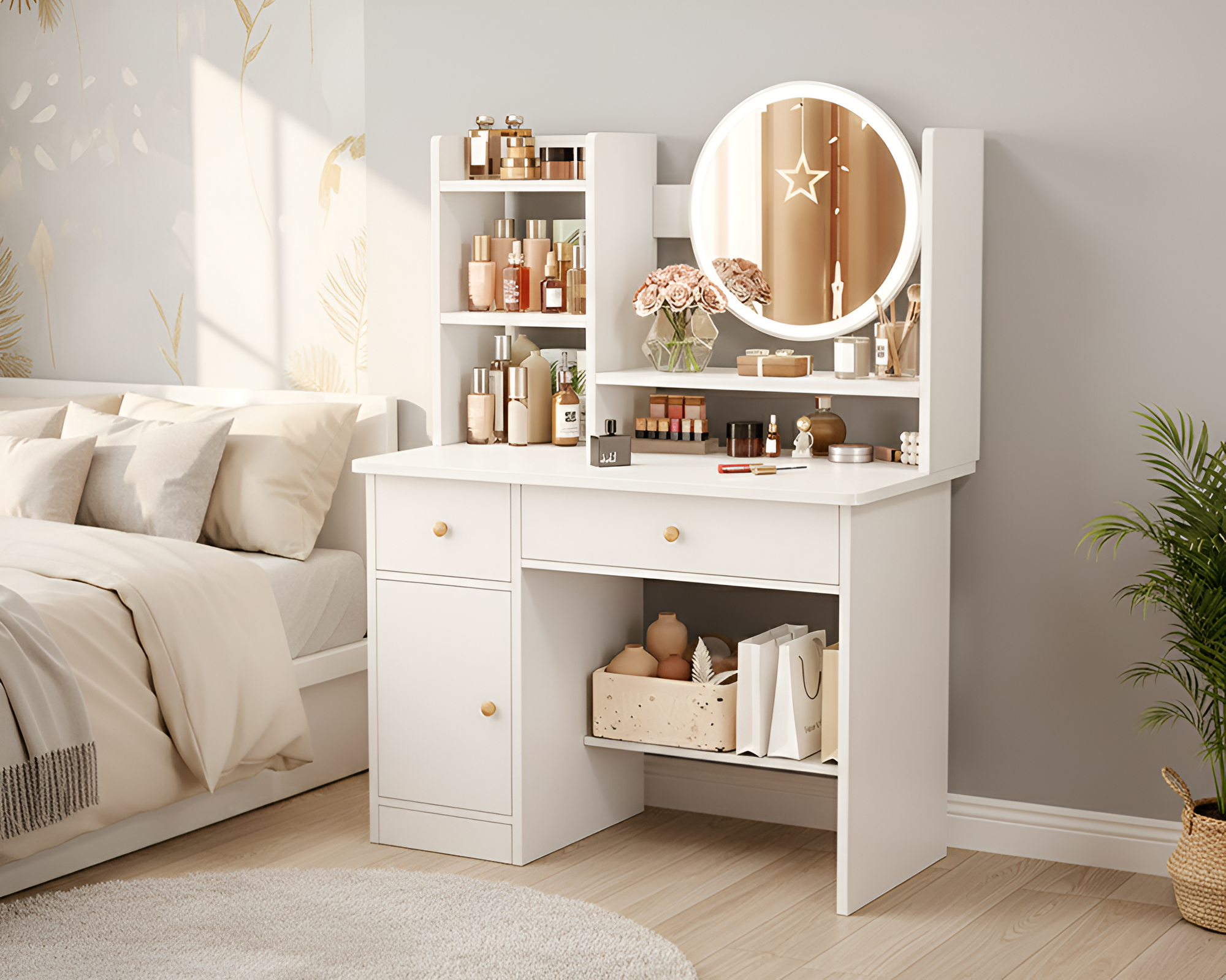 LED Mirror with Adjustable Brightness: The built-in LED Mirror offers three lighting modes—dim, Dressing table medium, and bright—perfect for makeup, skincare, or nighttime routines.