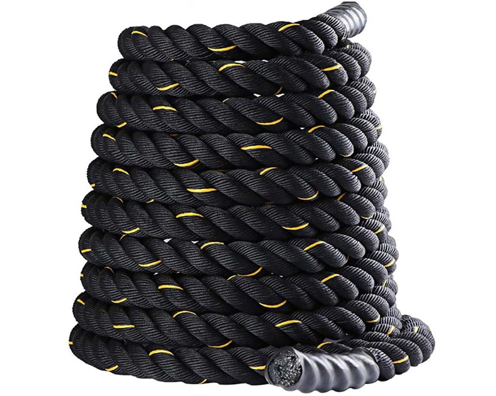 • The Battle Rope goes by many names, including combat rope, premium quality swing rope, training rope, sports rope, and climbing exercise or tug rope. Its striking black and yellow color combination adds a vibrant touch to your workout space. Depending on the length and diameter, the 9M-38mm option weighs approximately 3.5 kg, providing the ideal balance between challenge and usability.