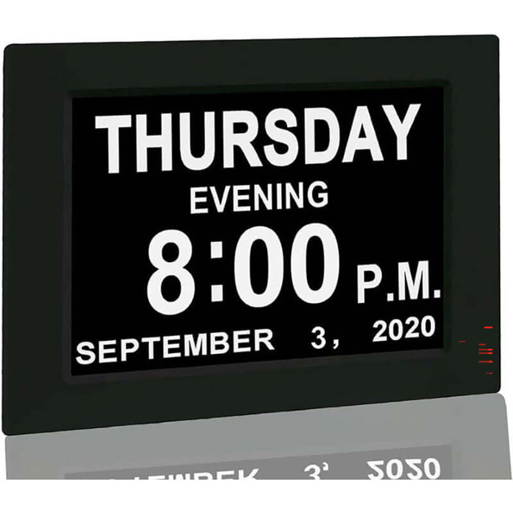 Digital Calendar Alarm Day Clock - with 8" Screen Display, AM PM, 5 Alarms, for Extra Impaired Vision People, Seniors, Dementia, Wall Mounted, Black Alarm Clock