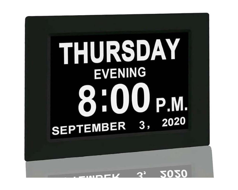 The Digital Calendar Alarm Day Clock features an 8" high-resolution display that clearly spells out the time, date, and month, making it ideal for those with impaired vision. It includes multiple alarm settings, perfect for reminding seniors to take medication throughout the day.