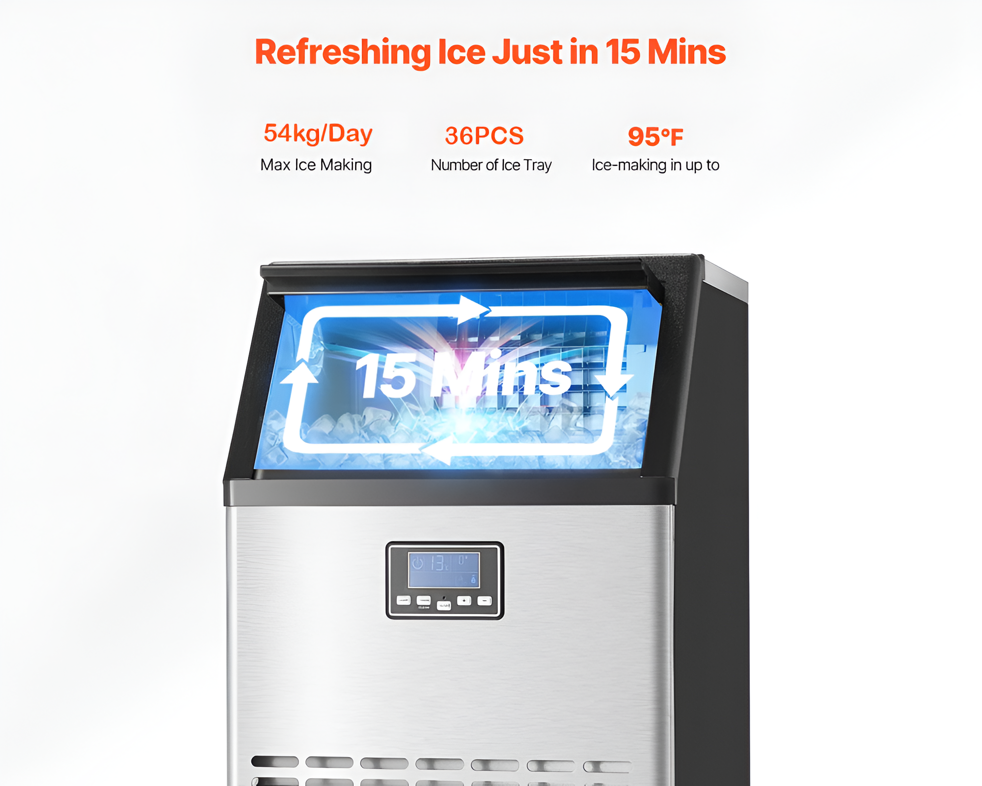 LCD Display & Push-Button Controls – Easy-to-use electronic panel with ice thickness adjustment, water indicators, and ice-making status.