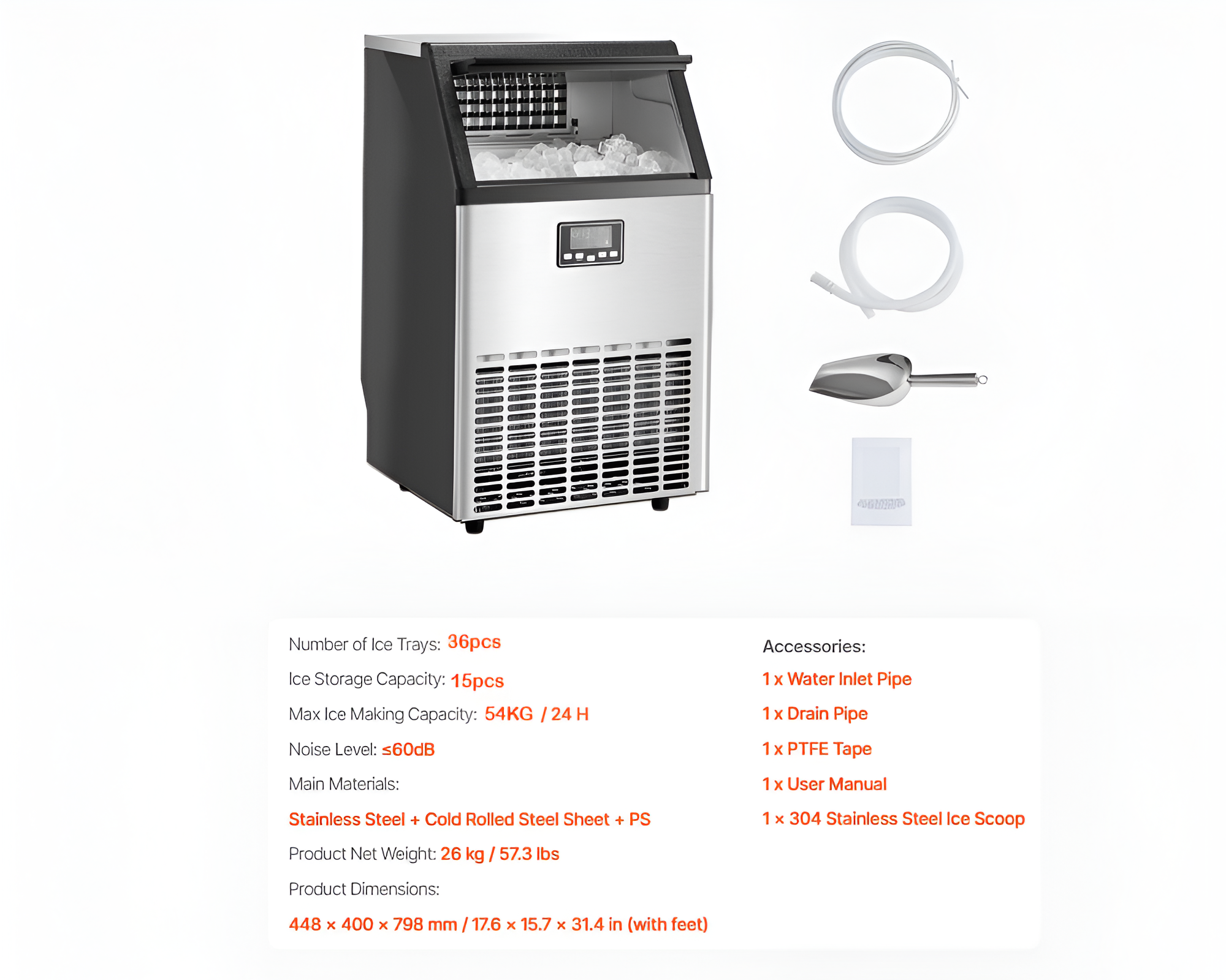 High Ice Production – Ice Cube Maker make up to 60kg of ice per day with a generous 11.5kg storage capacity, ideal for heavy use.