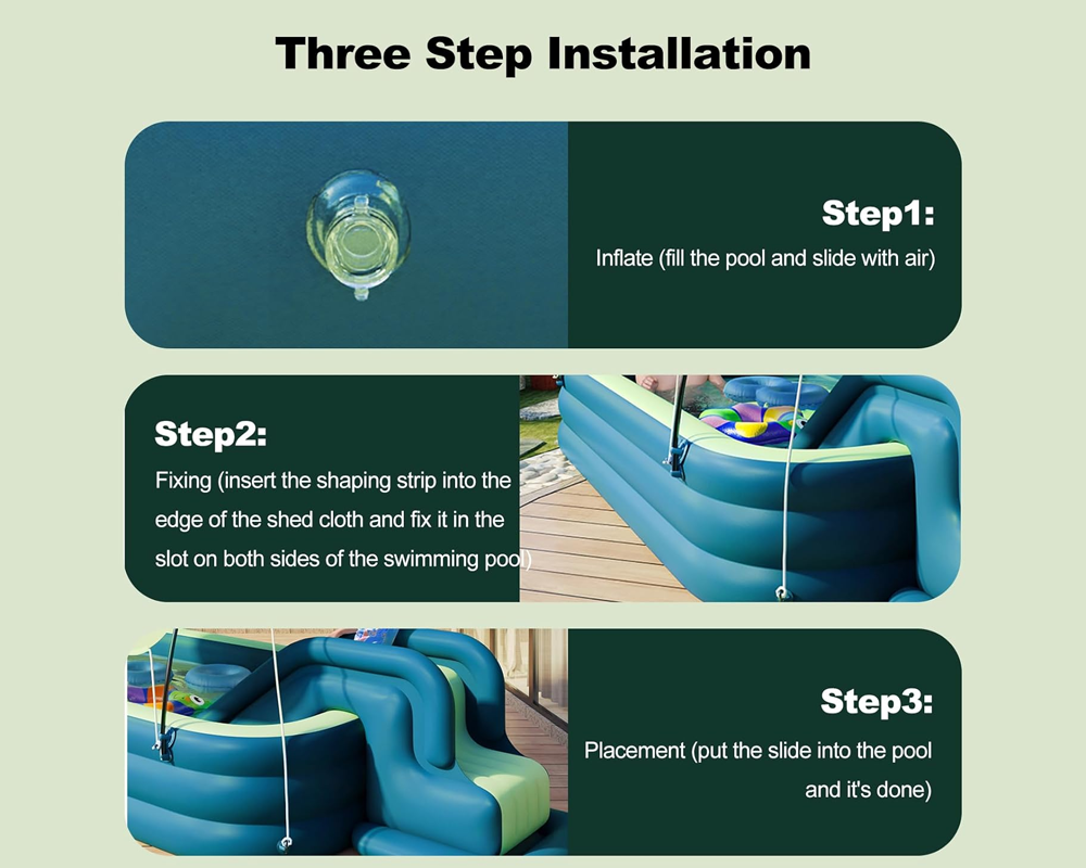 • 3-in-1 Water Fun Centre: Combines an inflatable swimming pool, inflatable water slide pool, and bouncy castle water park to create endless entertainment for kids and families.