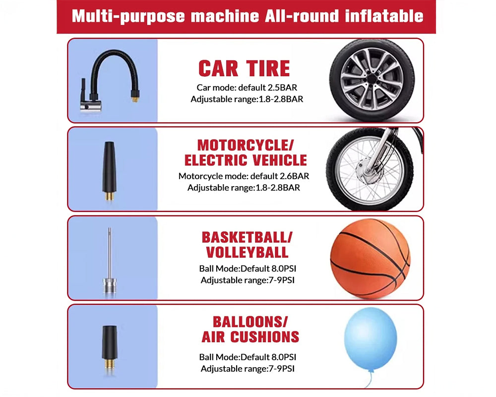 Smart Tire Inflator: Inflates tires, balls, and gear up to 150 PSI. Perfect for cars, bikes, and motorcycles—all powered by the Car Jump Starter.