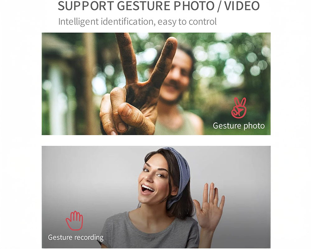 • Gesture Control: Use simple hand motions to take photos and videos.