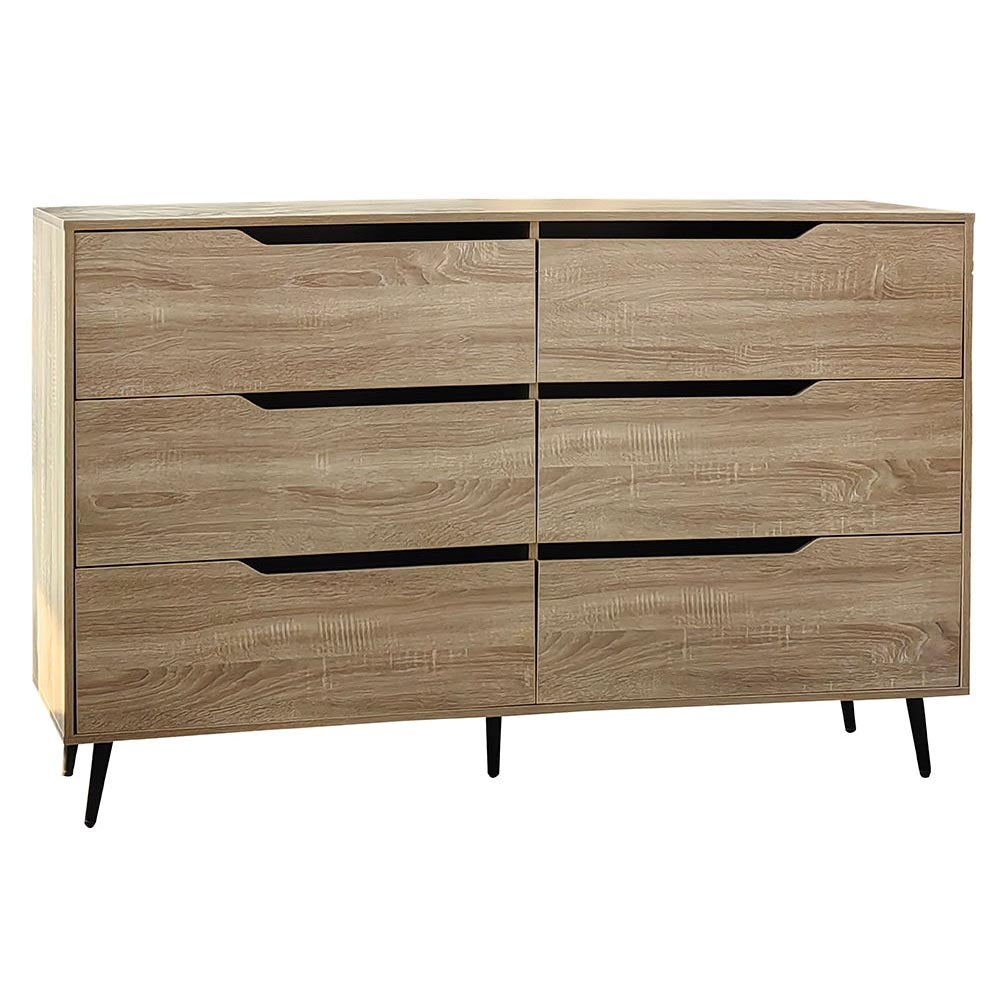 Upgrade your storage with the CURA 6-Drawer Chest, a perfect blend of modern aesthetics and practical functionality. Featuring a sleek rectangular silhouette, flared legs, and a natural wood grain finish, this dresser is ideal for bedrooms, living rooms, or entryways, Drawers seamlessly complementing modern, contemporary, and industrial decor.