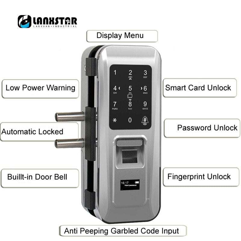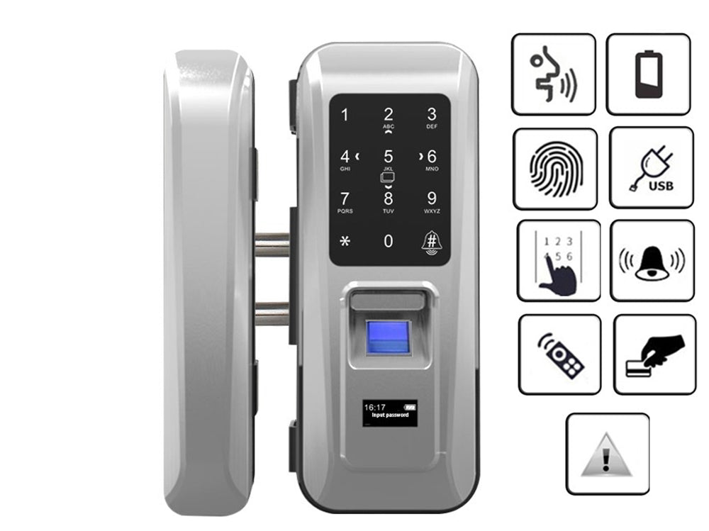 Upgrade your security with the Glass Door Lock – a cutting-edge keyless entry door lock designed to provide ultimate convenience and protection for your office or home. This intelligent lock integrates fingerprint recognition, RFID cards, and password access for a versatile, high-tech solution to securing your space. With its sleek and modern design, this smart lock offers both functionality and style.