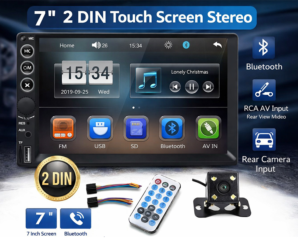 Upgrade your driving experience with this advanced 7 inch car stereo, a modern 2DIN car stereo designed for everyday convenience and entertainment. Featuring a responsive 7 inch touch screen car stereo, Bluetooth connectivity, MP5 multimedia playback, and rear camera support, this system delivers excellent performance for music, calls, and video playback.