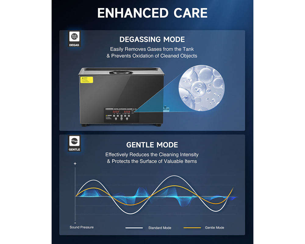 Heating can be set precisely, helping the ultrasonic cleaner dissolve oils and contaminants quickly. Degas mode improves performance by removing trapped air, ensuring the 30L ultrasonic cleaner operates at peak efficiency. This is especially beneficial for delicate components that rely on stable cavitation from a professional-grade ultrasonic cleaning machine.
