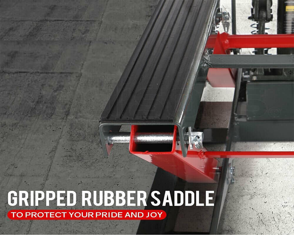 For safety, this Hydraulic Motorcycle Lift Jack includes a 3-position safety lock, non-slip rubber platform, and ratchet tie-down straps. The Hydraulic Motorcycle Lift Jack ensures stable and secure lifting during repairs and servicing.