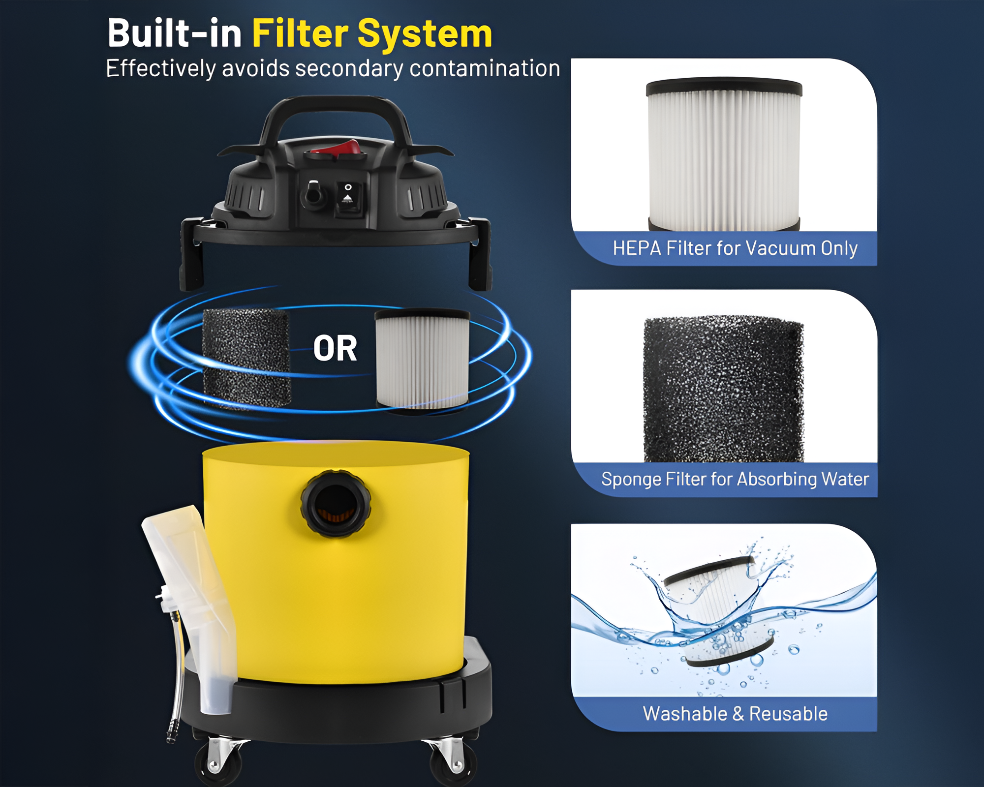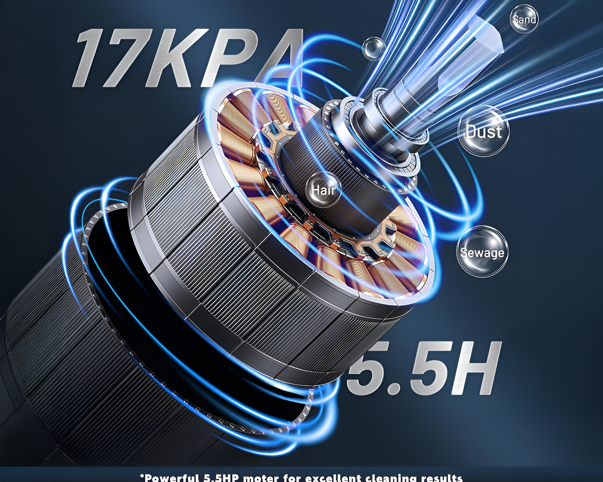 Powerful Suction: The Carpet Cleaner Machine 5.5 HP peak motor delivers up to 17 KPA, ensuring the Wet Dry Vacuum Cleaner 5-in-1 5.5HP removes dirt, debris, and liquid spills quickly.