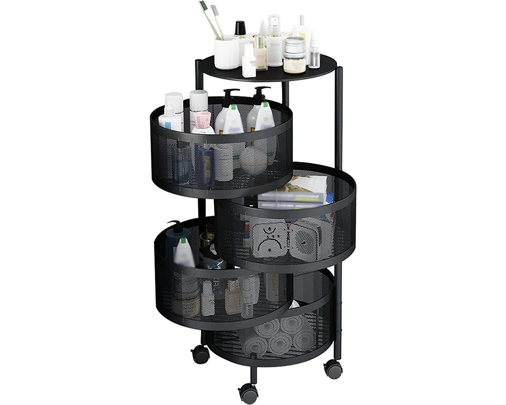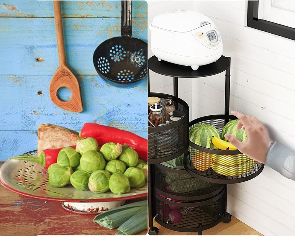 multi-layer storage rack, rotating organizer, kitchen floor rack, home organization rack, movable storage rack, household storage solution, mesh basket organizer, space-saving kitchen rack, modern kitchen organizer, rotating floor-standing storage
