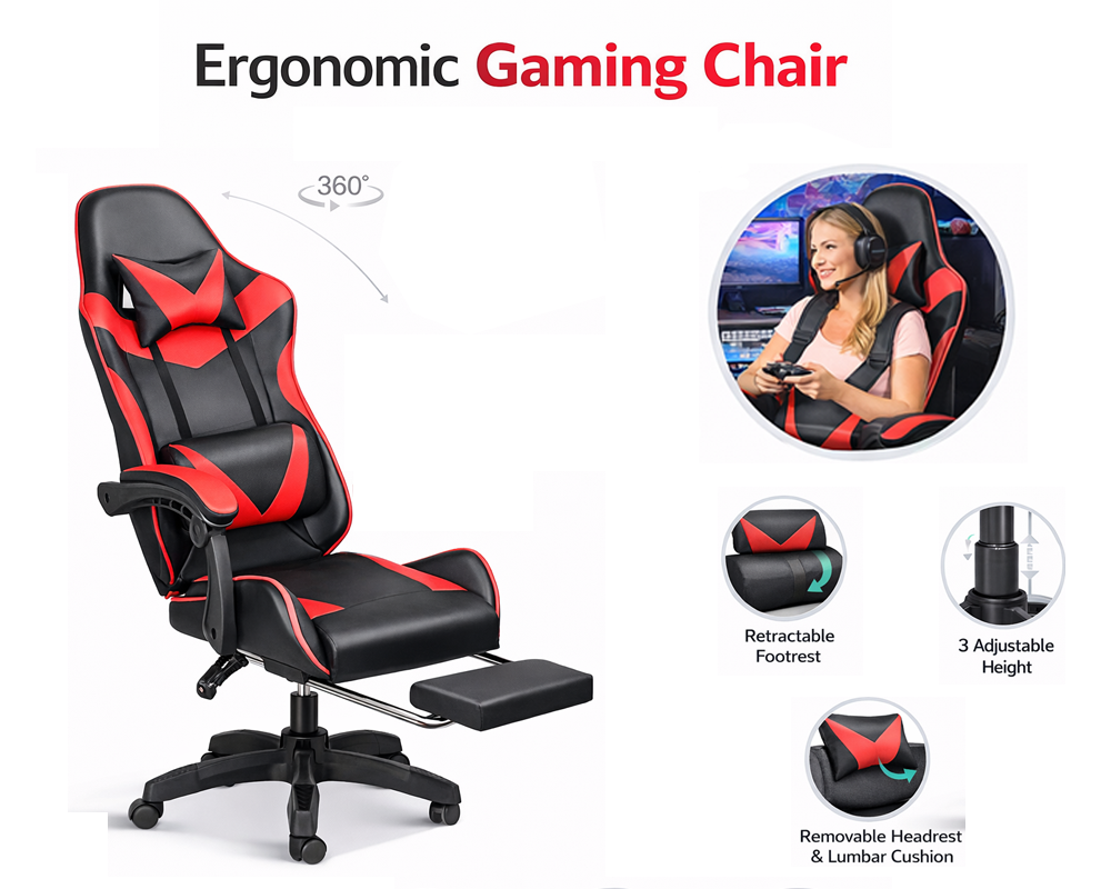 Enhance comfort and performance with this Ergonomic Gaming Chair with Footrest, designed for long gaming sessions, home office work, and everyday use. Combining ergonomic support, adjustable features, and a bold red design, this gaming chair helps reduce fatigue while improving posture and productivity.