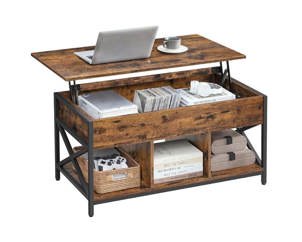 Add a stylish countryside touch to your living room with the VASAGLE Coffee Table. Featuring a matte-black X-shaped steel frame and rustic brown particleboard panels, this table blends elegance with individual character. It offers ample storage with two large open shelves for books and magazines, complemented by two drawers for organizing personal accessories discreetly. The firm particleboard tabletop and sturdy steel frame ensure long-lasting support, making it suitable for enjoying coffee with friends or as a TV cabinet for 32-inch TVs. Easy assembly with numbered parts and included tools. Upgrade your decor with this functional centerpiece!