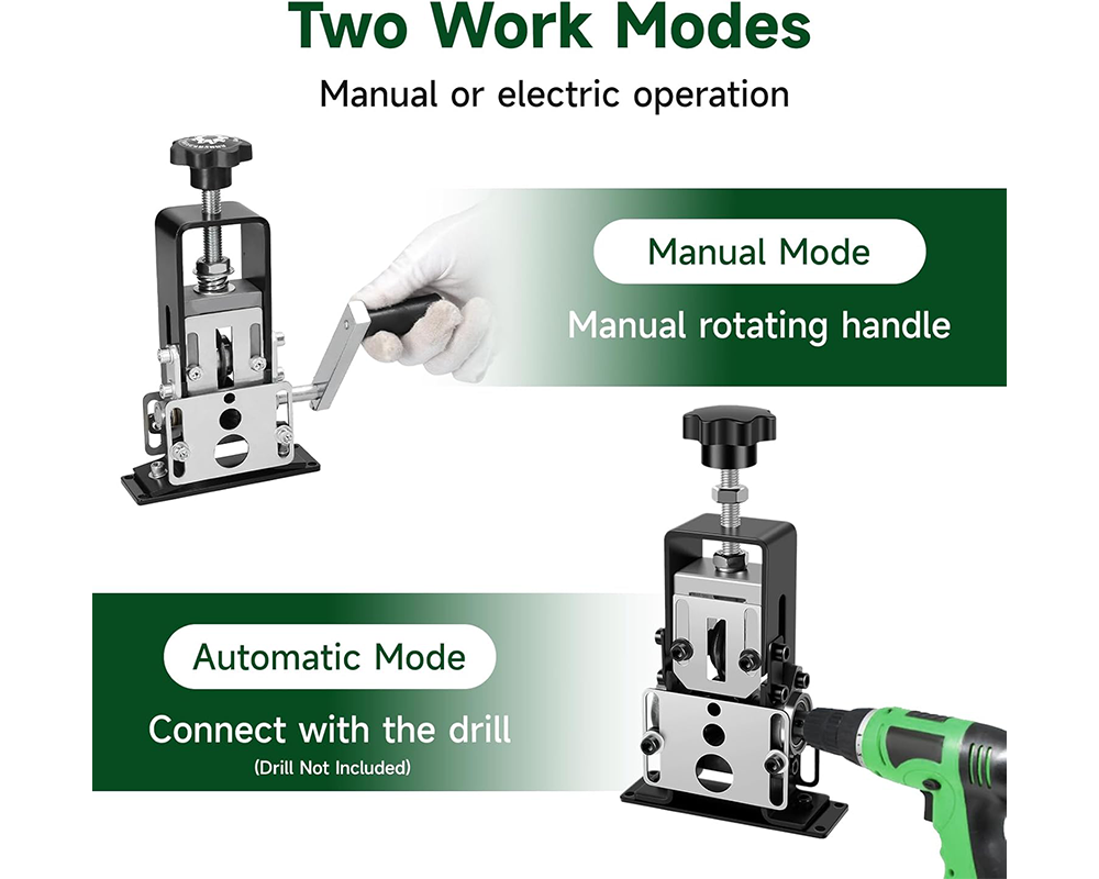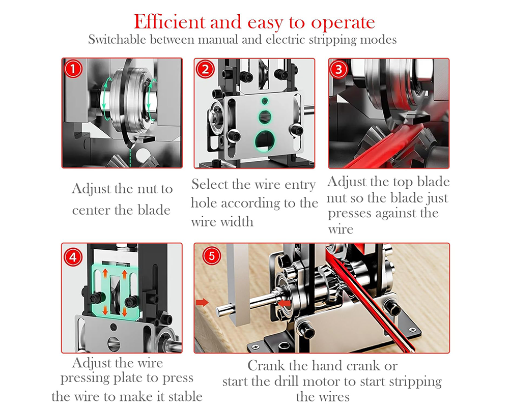 The Manual Wire Stripping Machine features a dual-operation design, allowing you to use it manually with the hand crank or connect it to a drill for faster operation. This flexible Manual Wire Stripping Machine setup enhances efficiency and convenience.